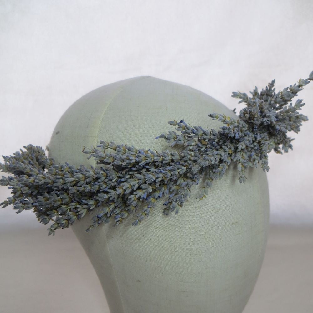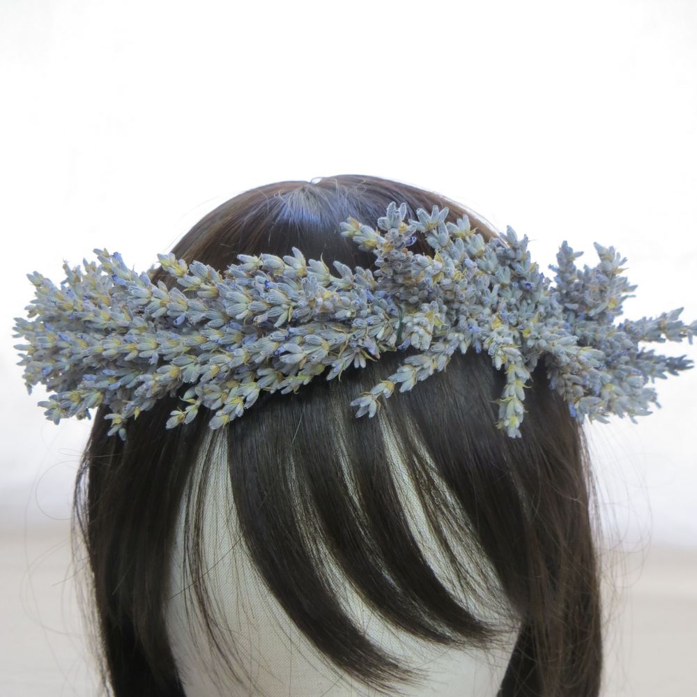 La corona de lavanda mide 4-5 cm. de ancho. Puedes elegir entre 2 longitudes. Para un niño, elige la más pequeña. Adapta la corona con la cinta de algodón natural que aparece en la foto. También puedes colocar otra cinta que combine mejor con los colores de tu vestido.